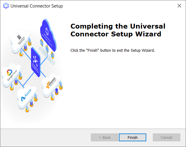 Once the installation is finished, the Completing the Universal Connector Setup Wizard dialog shows up. Click Finish to finish the installation.