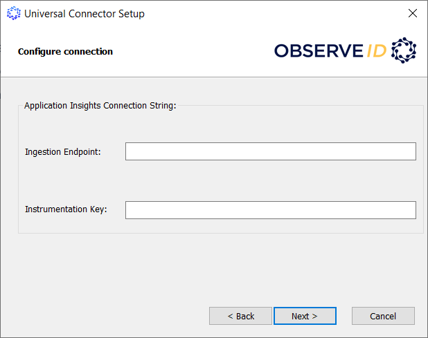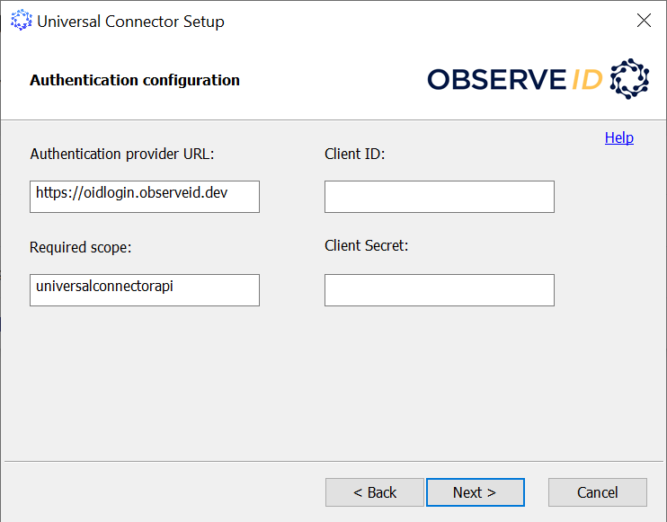 ObserveID Universal Connector is installed as a service on a Windows machine. The installation is performed with an installation file that runs an installation wizard to help you go through all steps of the configuration flow and ensure the service is installed according to your requirements. Below is a list of the wizard steps with details to follow: