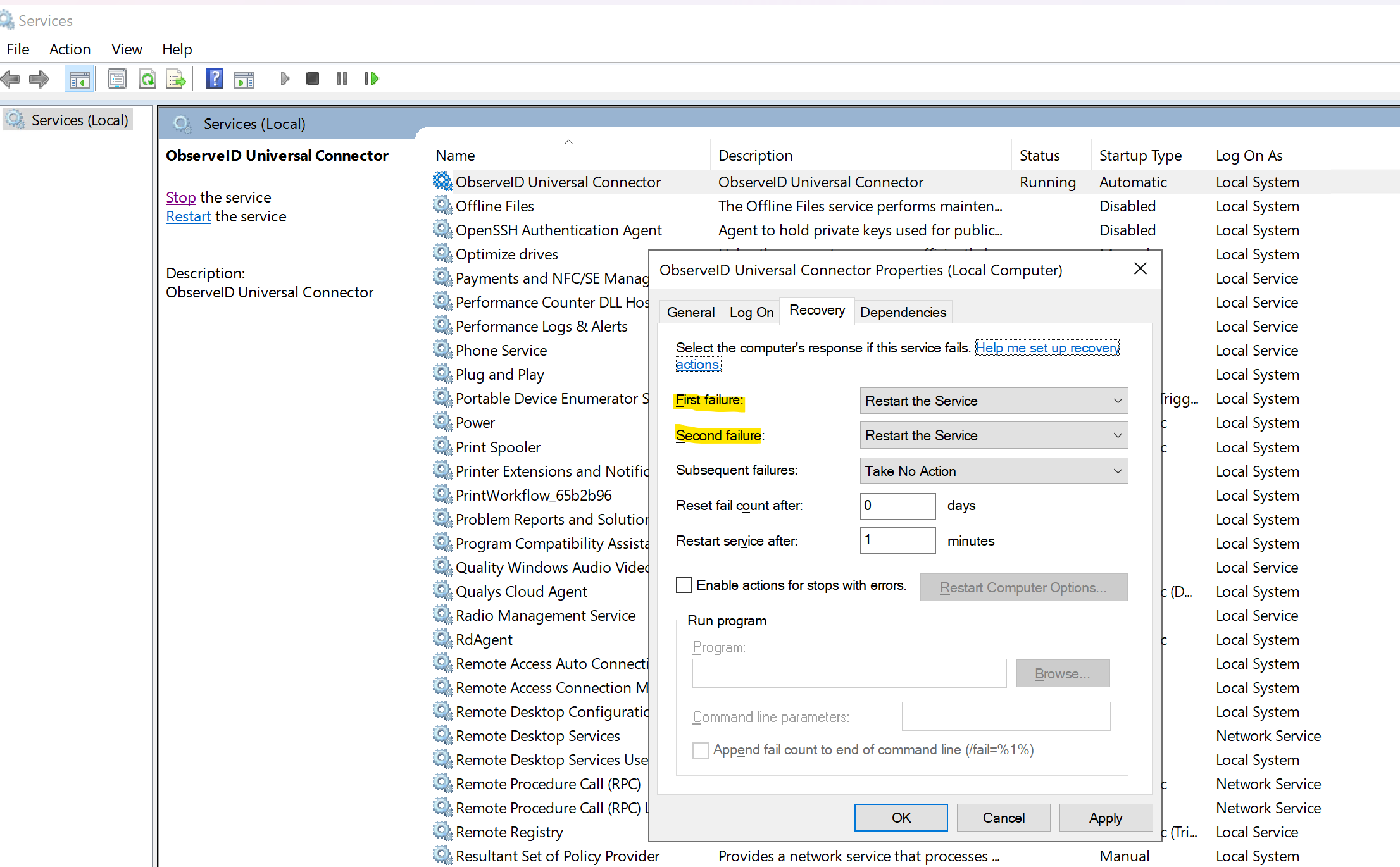 Once installed, the ObserveID Universal Connector is registered as a Windows service and can be managed through the system services interface (for example, started, stopped, or restarted).