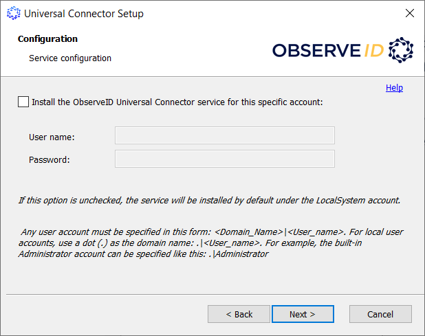 LocalSystem, click Next to skip the step and to move forward. - To set up a preferred account, check Install the ObserveID Universal Connector service for this specific account, then enter the user name and the password as the credentials of the preferred account, and click Next to go to the next step.